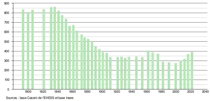 L'évolution du nombre d'habitants est connue à travers les recensements de la population effectués dans la commune depuis 1793. Pour les communes de moins de 10 000 habitants, une enquête de recensement portant sur toute la population est réalisée tous les cinq ans, les populations légales des années intermédiaires étant quant à elles estimées par interpolation ou extrapolation[27]. Pour la commune, le premier recensement exhaustif entrant dans le cadre du nouveau dispositif a été réalisé en 2006[28].