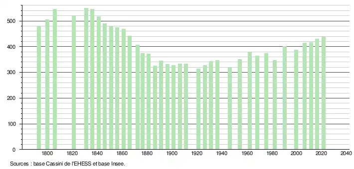 L'évolution du nombre d'habitants est connue à travers les recensements de la population effectués dans la commune depuis 1793. Pour les communes de moins de 10 000 habitants, une enquête de recensement portant sur toute la population est réalisée tous les cinq ans, les populations légales des années intermédiaires étant quant à elles estimées par interpolation ou extrapolation[24]. Pour la commune, le premier recensement exhaustif entrant dans le cadre du nouveau dispositif a été réalisé en 2006[25].