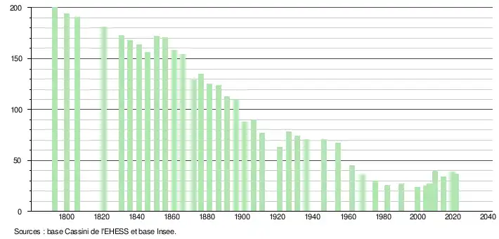 L'évolution du nombre d'habitants est connue à travers les recensements de la population effectués dans la commune depuis 1793. Pour les communes de moins de 10 000 habitants, une enquête de recensement portant sur toute la population est réalisée tous les cinq ans, les populations légales des années intermédiaires étant quant à elles estimées par interpolation ou extrapolation[15]. Pour la commune, le premier recensement exhaustif entrant dans le cadre du nouveau dispositif a été réalisé en 2004[16].