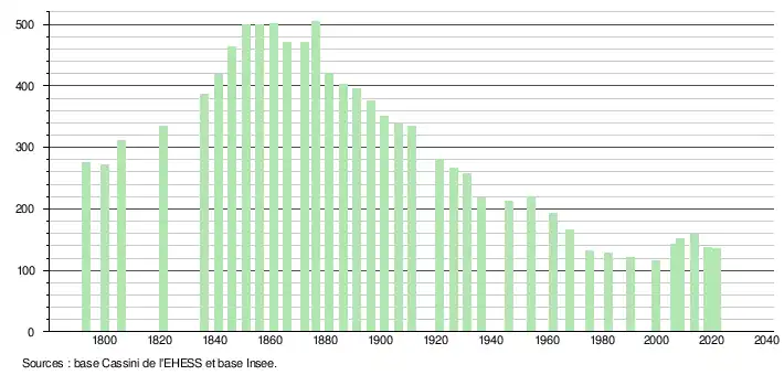 L'évolution du nombre d'habitants est connue à travers les recensements de la population effectués dans la commune depuis 1793. Pour les communes de moins de 10 000 habitants, une enquête de recensement portant sur toute la population est réalisée tous les cinq ans, les populations légales des années intermédiaires étant quant à elles estimées par interpolation ou extrapolation[13]. Pour la commune, le premier recensement exhaustif entrant dans le cadre du nouveau dispositif a été réalisé en 2008[14].