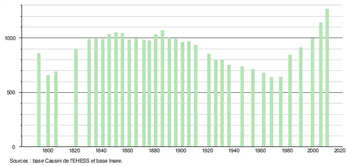 L'évolution du nombre d'habitants est connue à travers les recensements de la population effectués dans la commune depuis 1793. À partir du , les populations légales des communes sont publiées annuellement dans le cadre d'un recensement qui repose désormais sur une collecte d'information annuelle, concernant successivement tous les territoires communaux au cours d'une période de cinq ans. Pour les communes de moins de 10 000 habitants, une enquête de recensement portant sur toute la population est réalisée tous les cinq ans, les populations légales des années intermédiaires étant quant à elles estimées par interpolation ou extrapolation[4]. Pour la commune, le premier recensement exhaustif entrant dans le cadre du nouveau dispositif a été réalisé en 2005[5],[Note 1].