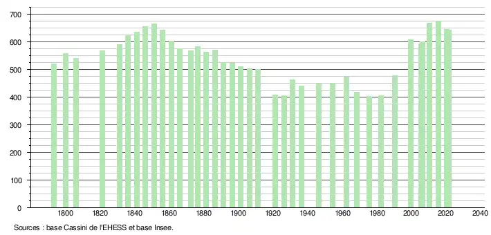 - Population municipale légale en vigueur au 1er janvier 2024, millésimée 2021, définie dans les limites territoriales en vigueur au 1er janvier 2023, date de référence statistique : 1er janvier 2021.