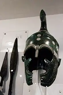 Les Thraces évitent traditionnellement les armures et les jambières pour conserver leur mobilité ; mais des armures en métal commencent à apparaître au IVe siècle av. J.-C. parmi la noblesse[24]. Des armures en écailles de type scythe sont également parfois utilisées. Le casque thrace, appelé aussi phrygien du fait de sa forme ressemblant à une bonnet, est adopté par les phalangites macédoniens. Durant l'époque hellénistique, les guerriers thraces adoptent le bouclier long, le thuréos[25], inspiré des Celtes et qui se répand ensuite à leur contact dans les armées lagides et séleucides. Enfin, les Thraces utilisent des équipements grecs de différentes périodes et portent parfois des armures qui ont cessé d'être utilisées ailleurs[26]. Plus tard, ils adoptent les armements romains[27]. Les guerriers thraces décorent leur corps de tatouages comme les Illyriens et les Gètes.