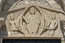 La façade occidentale, plutôt austère, est ornée d'une archivolte en plein cintre et de chapiteaux sculptés (atlante, personnages dans les ceps, oiseau).