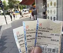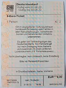 Le ticket à 9 euros (en allemand 9-Euro-Ticket) est un billet qui permettait d'utiliser presque tous les transports publics locaux et régionaux en Allemagne pour un prix de 9 euros par mois pendant les mois de juin, juillet et août 2022, c'est-à-dire les bus de banlieue, les métros et les trains de banlieue, ainsi que les liaisons de trains locaux et régionaux de la Deutsche Bahn (trains régionaux RB et RE en 2e classe) et d'autres entreprises de transport ferroviaire[1].