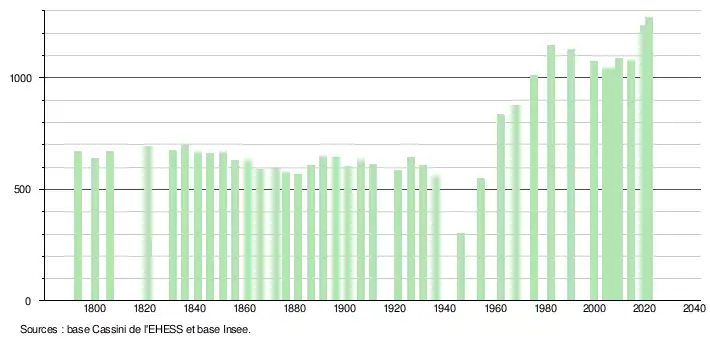 L'évolution du nombre d'habitants est connue à travers les recensements de la population effectués dans la commune depuis 1793. Pour les communes de moins de 10 000 habitants, une enquête de recensement portant sur toute la population est réalisée tous les cinq ans, les populations légales des années intermédiaires étant quant à elles estimées par interpolation ou extrapolation[32]. Pour la commune, le premier recensement exhaustif entrant dans le cadre du nouveau dispositif a été réalisé en 2004[33].