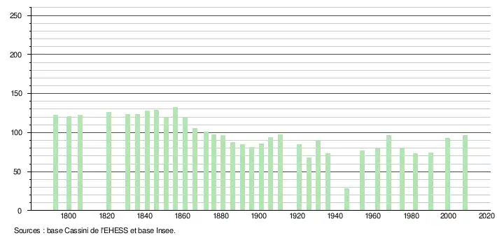 - Dans le tableau des recensements et le graphique, par convention dans Wikipédia, le principe a été retenu, pour les populations légales postérieures à 1999 de n’afficher dans le tableau des recensements et le graphique que les populations correspondant à l'année 2006, première population légale publiée calculée conformément aux concepts définis dans le décret no 2003-485 du 5 juin 2003, et les années correspondant à une enquête exhaustive de recensement pour les communes de moins de 10 000 habitants, ainsi que la dernière population légale publiée par l’Insee.