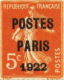 En 1893 à Paris, les postes expérimentèrent des timbres préoblitérés spécifiques pour l'affranchissement des journaux et des imprimés[2]. Des timbres au type Paix et Commerce sont marqués à la roulette par une surcharge de quatre lignes entre janvier et , cinq lignes entre septembre et : « PARIS - IMPR. », puis en dessous, des éléments de datation. Quelques entreprises ont utilisé ce service à l'époque, notamment les Grands Magasins du Louvre et Le Bon Marché.