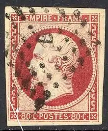 Le , est la première date connue d'utilisation d'un timbre non dentelé de 80 centimes de couleur carmin représentant l'empereur Napoléon III et légendé « EMPIRE FRANC ». Il remplace le 1 franc carmin émis en septembre 1853 à la suite de la baisse des tarifs de bureau à bureau en France, le .