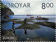 Le , dans le cadre de l'émission Europa, sont émis deux timbres sur le thème annuel du tourisme. C'est le point de vue des touristes qui marquent les deux photographies choisies, alors que, le plus souvent, les timbres des Féroé montrent peu d'êtres humains dans les photographies de paysages. Le 6,50 DKK montre ce qu'il est possible d'observer lors d'une promenade en mer à l'ouest de l'île de Hestur à bord de la Norðlýsið, vedette d'un hôtel local. Sur le 8 DKK, des touristes achèvent l'exploration de Stóra Dímun et rejoignent à l'aide d'un bateau pneumatique la Norðlýsið.