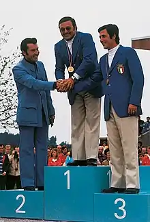 Fosse olympique; de G. à D. Carrega, Scalzone vainqueur, et Basagni.