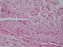 - le tissu épithélial est un ensemble de cellules serrées les unes aux autres formant un ensemble avasculaire mais innervé, séparé d'un tissu conjonctif sous-jacent par une structure de soutien, la lame basale. Ce type de tissu est de revêtement lorsqu'il se retrouve sur les surfaces qui jouxtent le milieu externe ou les cavités de l'organisme. Il est glandulaire lorsqu'il est regroupé en structure spécialisée dans la production de sécrétion ou d'hormone. Le tissu épithélial dérive essentiellement de l'endoderme et de l'ectoderme, et dans une faible part du mésoderme ;