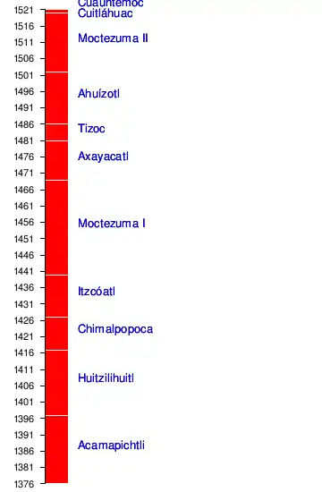 | Axayacatl ? - 1481 | Tizoc ? - 1486 | Ahuitzotl ? - 1502 | |||||||||||||||||||||||||||||||||||||||||
