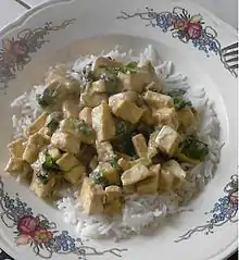 Le tofu (prononciation : /tɔ.fy/ au Québec[1] ou /tɔ.fu/ ) ou fromage de soja est un aliment d'origine chinoise, issu du caillage du lait de soja. C'est une pâte blanche, molle, peu odorante et au goût plutôt neutre, constituant une base importante de l'alimentation de l'Asie de l'Est et du Sud-Est. Il est aussi consommé par des végétariens et végétaliens parce qu'il peut être utilisé comme ingrédient dans de nombreuses recettes de cuisine.