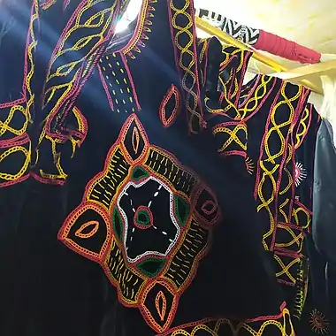 Traditionnellement, il est confectionné de velours de couleur noire. Sur celles ci, sont brodés à la main des motifs et décorations avec du fil ou des bandes de couleurs jaune, orange, ocre, rouge, blanc….
