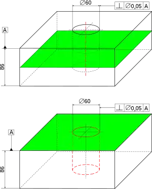 - une représentation en perspective de la pièce idéale avec la cotation de la perpendicularité ; A est le nom du plan, t est la tolérance (un nombre en millimètres, typiquement entre 0,01 et 1 mm) ;