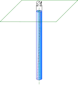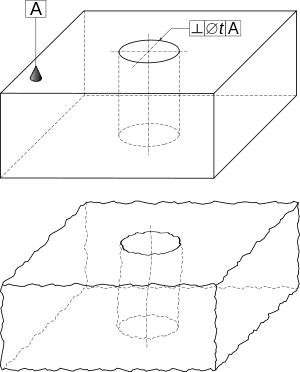 Reste à définir les orientations acceptables de l'axe par rapport au plan. Pour cela, on prend la normale au plan, et on construit un cylindre ayant pour axe cette normale, et ayant pour diamètre la tolérance, indiquée en millimètres ; c'est la zone de tolérance (ZT). L'alésage est conforme si l'axe du cylindre parfait associé peut être placé entièrement dans cette zone de tolérance.