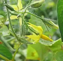 La fleur de tomate est actinomorphe à symétrie pentamère. Le calice compte cinq sépales verts. Ce calice est persistant après la fécondation et subsiste au sommet du fruit. La corolle compte cinq pétales jaune vif, soudés à la base, souvent réfléchis en arrière, et formant une étoile à cinq pointes. L'androcée compte cinq étamines à déhiscence latérale introrse[N 1]. Les anthères allongées forment un cône resserré autour du pistil. Celui-ci est constitué de deux carpelles soudés, formant un ovaire supère biloculaire (à deux loges) et à placentation centrale. Chez certaines variétés, l'ovaire est pluriloculaire.