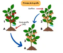 - comme pomate : la pomme de terre et la tomate étant toutes deux des solanacées, les chercheurs ont greffé les deux, d'où l'obtention sur la même plante, de tomates en aérien et de pommes de terre en sous-sol[22].