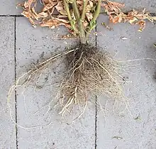 Son système racinaire est de type pivotant à tendance fasciculée. Très dense et ramifié sur les trente premiers centimètres, il peut atteindre un mètre de profondeur.