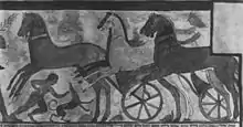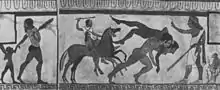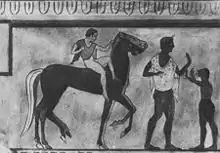 - Cette scène est mieux représentée dans la Tombe des Jongleurs à Tarquinia : Il s'agit d'un lancer de petits plateaux sur un candélabre posé sur la tête de la danseuse dansant au centre au son de la flûte.