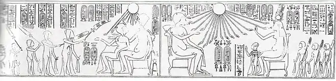 Sur le mur est, Akhenaton est représenté conduisant sa mère Tiyi vers un temple. Ils sont accompagnés de la princesse Baketaton lorsqu'ils entrent dans le temple. Néfertiti et ses filles ne sont pas représentées dans cette scène.