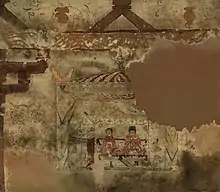 Le mur nord de la chambre principal présente le couple des défunts, assis sous de somptueux rideaux et encadré par une structure en bois. Deux guerriers noirs les entourent, reprenant ainsi un motif de la tombe de Yaksuri. Par rapport à la période précédente, les techniques descriptives se sont améliorées[2].
