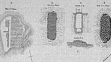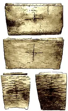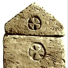 Dessin du tombeau de Talpiot A découvert à Talpiot-Est le 27 mars 1980. La façade est ornée d'un chevron taillé dans la roche avec, en son centre, un oculus. Détail unique observé jusqu'ici seulement sur cette tombe datée du Ier siècle de l'ère commune (période tardive du Second Temple de Jérusalem), un appendice prolonge le faîte du fronton. | ||