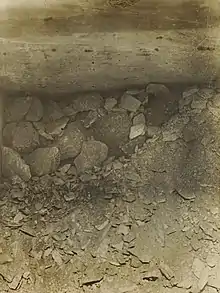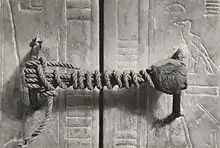 - L'exploration avant la visite du service des Antiquités étant illicite, Carter a bouché le trou percé dans le coin inférieur droit de cette porte avec du plâtre frais, qu'il dissimule avec une botte de roseaux et une corbeille en osier