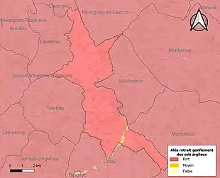 Le retrait-gonflement des sols argileux est susceptible d'engendrer des dommages importants aux bâtiments en cas d’alternance de périodes de sécheresse et de pluie[19]. La totalité de la commune est en aléa moyen ou fort (91,8 % au niveau départemental et 48,5 % au niveau national)[Carte 2]. Depuis le , en application de la loi ELAN, différentes contraintes s'imposent aux vendeurs, maîtres d'ouvrages ou constructeurs de biens situés dans une zone classée en aléa moyen ou fort[Note 3],[20].