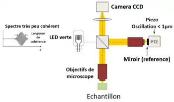 Plus précisément, les images interférométriques sont créées par un interféromètre de Michelson où la différence de marche optique est balayée par un composant électrique rapide (habituellement un miroir piézoélectrique dans le bras de référence). Ces images acquises par une caméra CCD sont combinées en post-traitement (ou en direct) par la méthode de déphasage interférometrique, où habituellement 2 ou 4 images par période de modulation sont acquises selon l'algorithme utilisé[25],[26].