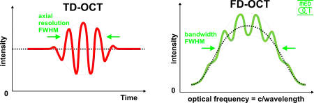 Les résolutions latérale et axiale en OCT sont indépendantes l’une de l’autre : la première dépendant des optiques du montage et la seconde étant fonction de la longueur de cohérence de la source lumineuse. La résolution axiale en OCT est définie par :