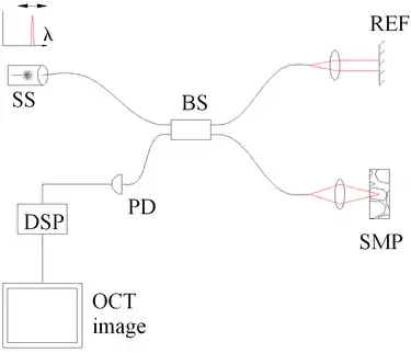 La lumière dans un système OCT est divisée sur 2 bras : un bras échantillon (qui contient l’objet que l’on veut imager), et un bras de référence (le plus souvent un miroir). La combinaison de la lumière réfléchie par l’échantillon et de celle provenant de la référence donne lieu à des interférences, mais seulement si la lumière a parcouru la même distance dans chacun des bras, à une longueur de cohérence près. En balayant le miroir de bras de référence, un profil de réflectivité de l’échantillon peut être obtenu (c’est de l’OCT temporel). Les parties de l’échantillon qui retroréfléchissent beaucoup de lumière donneront plus d’interférence que les autres, créant ainsi un contraste. Toute lumière réfléchie à partir d’un autre plan en profondeur dans l’échantillon aura parcouru une distance trop grande (supérieure à la longueur de cohérence de la source) et n’interfèrera pas[16].