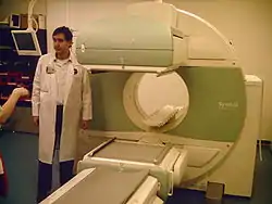 On réalise l'image de la distribution du radiopharmaceutique à l'aide d'une gamma-caméra tournant autour du patient. Celle-ci est essentiellement constituée d'un collimateur (permettant la sélection angulaire des photons) et de détecteurs de rayons gamma. Grâce à un algorithme de reconstruction tomographique, la cartographie tridimensionnelle de l'activité radioactive est estimée et ainsi la distribution du radiopharmaceutique dans l'organisme.