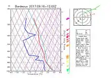 Le sondage supra indique les conditions atmosphériques à Bordeaux à 14 h juste avant le passage du front froid[6].