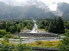 Vue du torrent de la Creuse et de sa confluence depuis la route des Gaillands en rive droite de l'Arve avec en haut à droite le glacier des Bossons.