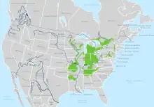 - aux États-Unis au Vermont, dans l'État de New York, au Maryland, en Pennsylvanie, au New Jersey, en Virginie, en Virginie-Occidentale, en Caroline du Nord, en Géorgie, en Alabama, au Mississippi, au Tennessee, au Kentucky, en Louisiane, en Oklahoma, en Arkansas, au Missouri, en Illinois, en Indiana, en Ohio, au Michigan, en Iowa, au Kansas, au Minnesota et au Wisconsin.