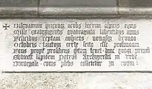 Sur la pierre le texte en hexamètres est orthographié à la façon médiévale : on trouve des abréviations et un e au lieu de ae ou oe (equis, ceptam, Archipresul, colletetur, evum). Le premier mot, disquadram, qu'on chercherait en vain dans le dictionnaire, est surprenant. Tenant compte du préfixe négatif dis et de quadrus, carré, on en déduira un manque : que la base de la tour serait irrégulière. D’aucuns ont voulu lire bisquadram, deux fois carrée, donc octogonale, ce qui ne serait pas péjoratif. Mais outre le fait que l’inscription ne porte pas un B-, mais un D-, la base de la tour n’est pas octogonale. La base déformée, disquadra, de la tour est justifiée par la hauteur extrême de celle-ci[8],[9]: