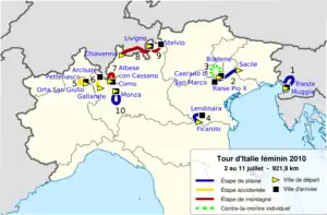 Contrairement à l'édition précédente, qui s'est déroulée intégralement dans le sud de l'Italie, le Tour d'Italie féminin 2010 traverse seulement le Nord de l'Italie. Le parcours semble privilégier les grimpeuses pures.