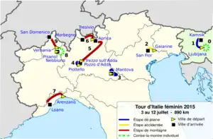 - (en) Cet article est partiellement ou en totalité issu de l’article de Wikipédia en anglais intitulé « 2015 Giro d'Italia Femminile » (voir la liste des auteurs).