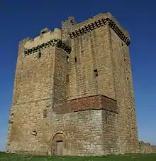 Le parapet surmontant les deux tours est doté de corbeaux et de mâchicoulis, qui sont inhabituellement plus grossiers sur la partie la plus récente de l'édifice[2].