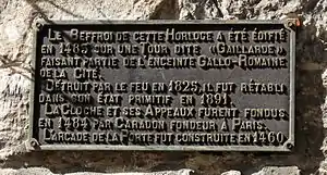 La guerre de Cent Ans secoue toujours le pays. En 1411 les bourgeois font installer dans la tour de l'église Saint-Eusèbe[n 3] une grosse horloge à ressorts et sonnerie, pour assurer une plus grande régularité dans le service de défense de la ville. C'est également là que se trouve la loge des guetteurs. Mais Saint-Eusèbe est excentrée et la cloche du guet est seulement entendue par une petite partie de la ville ; les habitants veulent installer leur système d'alerte en position plus centrale dans la ville[9]. L'emplacement de la tour Gaillarde leur paraît approprié, et en 1425 la construction de la charpente commence dans le cloître de l'église des Cordeliers. Mais les copeaux prennent feu : dortoirs, réfectoire, bibliothèque et église avec ses ornements et ses orgues, sont détruits dans cet incendie[12].