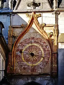 Appuyée à la tour, une chambre contient le mécanisme de l'horloge. Le cadran se répète des deux côtés de la porte[2]. Chaque cadran est divisé en deux fois 12 sections[3], avec les heures marquées en chiffres romains de I à XII et les demi-heures indiquées par des losanges[2].