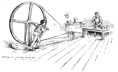 « Le tour à main ordinaire, en Chine ou au Japon, possède une large et lourde girelle en bois portant quatre entailles près de la circonférence. Lorsque l'élan se ralentit, le tourneur insère adroitement une courte baguette dans l'une de ces entailles et entraîne vigoureusement la girelle, répétant son mouvement environ six fois. Cet élan dure assez longtemps pour tourner une petite pièce, mais doit être constamment renouvelé pour le façonnage d'une grande. »