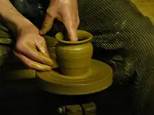 Une sculpture en bois montre un potier en train de monter un vase ; le tour est actionné par un aide[5].