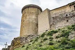La tour, haute de 27 mètres avec des murs dépassant en plusieurs points 5 mètres d'épaisseur, s'étend sur 4 niveaux et est bordée de mâchicoulis[1].