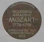 Au cours de la maladie de Leopold, les performances étaient impossibles et Wolfgang s'est tourné vers la composition de symphonies. Nannerl précise d'après ses souvenirs que c'était à Ebury Street, mais d'autres éléments de preuve sont en contradiction avec cela[40]. La biographe Jane Glover dit que Wolfgang a été inspiré par Bach après l'avoir rencontré et entendu ses symphonies, et a décidé de composer ses propres œuvres[41]. Le moment où Wolfgang a rencontré pour la première fois Bach ou entendu ses symphonies n'est pas clair, mais il a joué des œuvres pour clavecin de Bach dans son récital royal en [42]. Quelle que soit la date précise, Wolfgang achevé rapidement sa Symphonie no 1, en mi bémol majeur, pour orchestre (K. 16), et a commencé sa Symphonie no 4 en ré majeur (K. 19) dont Zaslaw conclut qu'elle a été essentiellement composée, ou au moins terminée à La Haye[43],[Note 5]. Wolfgang Hildesheimer décrit la Symphonie en ré majeur dans ces termes : « l'originalité de la mélodie et de la modulation va au-delà de la routine de ses méthodes contemporains [adultes] »[44]. Il s'agit des premiers écrits pour orchestre de Wolfgang Mozart, bien que Zaslaw signale qu'une « Symphonie 0 » ait pu exister selon des croquis du carnet de Wolfgang[45]. Trois symphonies sont aujourd'hui perdues, identifiées dans le catalogue Köchel des œuvres de Mozart que par leur incipit (premières mesures) ont pu aussi dater de la période de son passage à Londres[31]. D'autres œuvres sont composées par Mozart à Londres dont plusieurs sonates instrumentales. La plus impressionnante est, selon Hildesheimer, la « Sonate, en do majeur, pour piano à 4 mains » (K. 19d)[46]. Il a également écrit ses premières œuvres vocales, le motet « God is Our Refuge, motet pour chœur à 4 voix mixtes (SATB) a cappella » (K. 20), et l'aria pour ténor « Va, dal furor portata, air pour ténor avec orchestre » (K. 21)[47]. Un ensemble de sonates, avec des parties de flûte et de violoncelle a été dédié à la Reine-Charlotte sur sa demande et présenté à elle en [48].