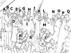 Légende : A. Ray Lindwall, B. Ernie Toshack, D. Don Bradman, E. Sam Loxton, G. Doug Ring, H. Keith Miller, I. Lindsay Hassett, J. Bill Johnston, K. Ian Johnson, L. Don Tallon, M. Keith Johnson, N. Arthur Morris, O. Ron Saggers, P. Sid Barnes, Q. Bill Brown, R. Ron Hamence, S. Neil Harvey, T. Colin McCool