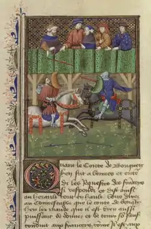 La tournoi entre les chevaliers anglais et français prend la forme de duels à armes nommées. Les combats se déroulent à pied avec successivement pour chaque adversaire cinq coups de lance, cinq coups d’épée, cinq coups de hache et cinq coup de dague[a 1].