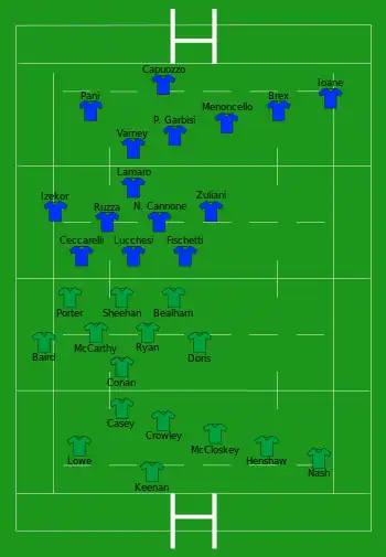 Pour préparer la troisième journée, Simone Ferrari, Louis Lynagh, François Carlo Mey sont convoqués tandis que Tommaso Allan a demandé à ne pas être sélectionné pour pouvoir se reposer. De plus, Pietro Ceccarelli, Edoardo Iachizzi, Lorenzo Cannone et Sebastian Negri sont forfaits pour cette rencontre[43],[44]. Cependant, quelques jours plus tard, François Carlo Mey est contraint de déclarer forfait, il est remplacé par Giovanni Licata[45]. Le , c'est au tour de Matteo Nocera (en) de déclarer forfait pour ce troisième match, il est remplacé par Filippo Alongi (en)[46].